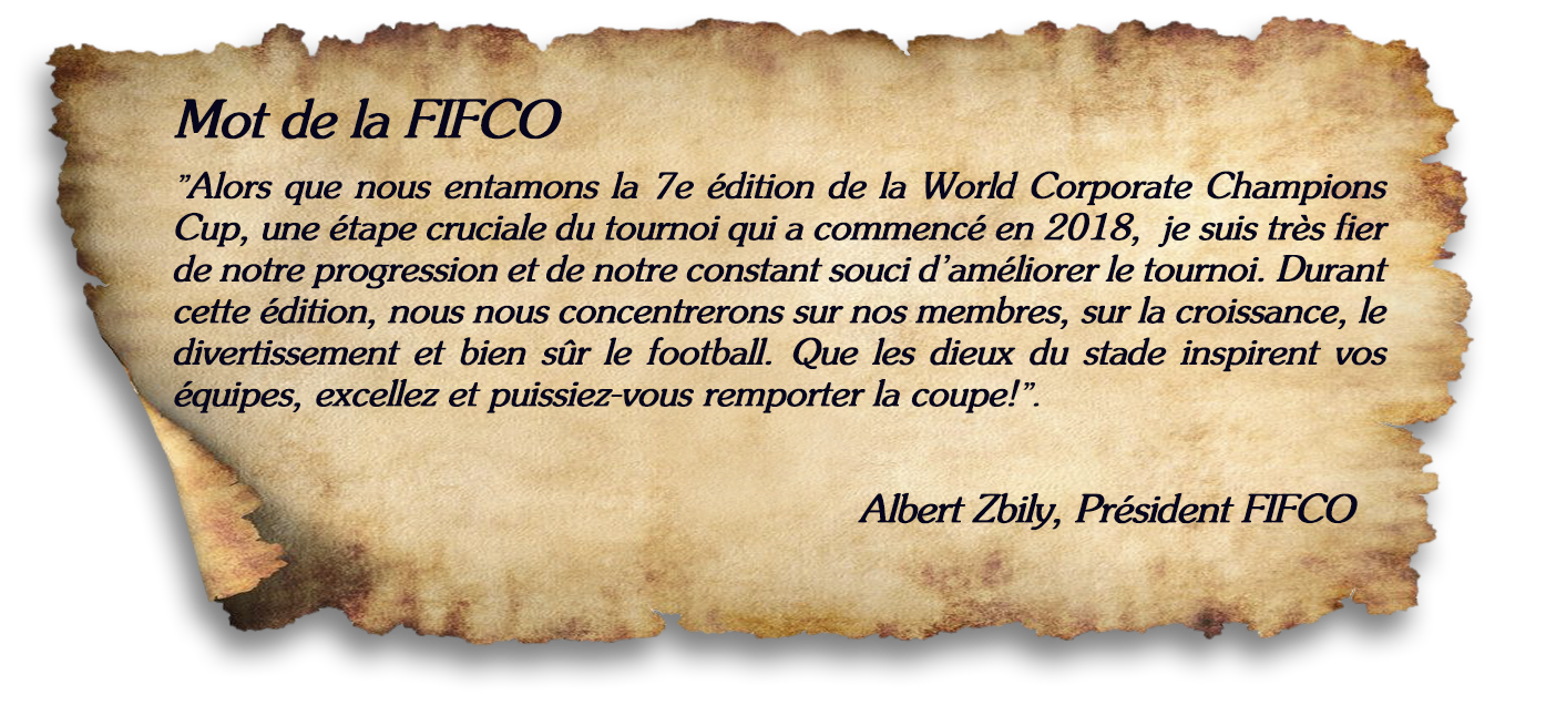 Chaque pays membre en règle sera autorisé à envoyer une équipe de football d’entreprise officiellement reconnue au tournoi. Le coût de participation est basé sur un prix individuel pour un séjour de 4 nuits dans un hôtel 5 étoiles. Pour chaque joueur participant au tournoi, la FIFCO fournira: